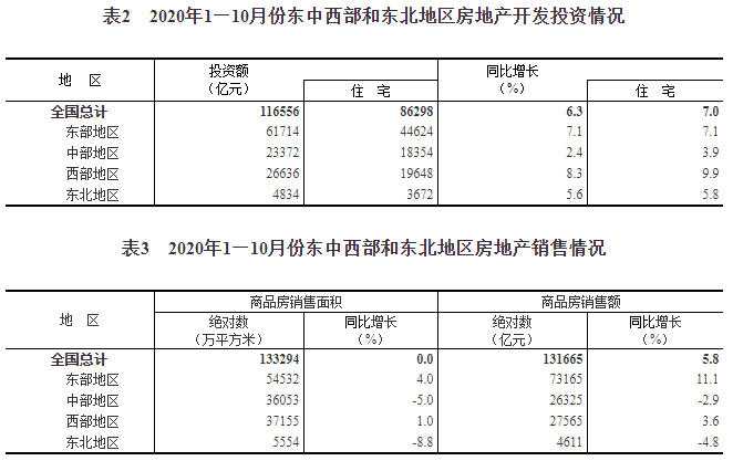1—10月份,东部地区房地产开发投资61714亿元,同比增长7.1%,增速比1—9月份提高0.6个百分点;中部地区投资23372亿元,增长2.4%,增速提高1.5个百分点;西部地区投资26636亿元,增长8.3%,增速提高0.2个百分点;东北地区投资4834亿元,增长5.6%,增速提高1.2个百分点。