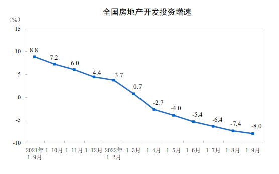 国家统计局数据显示,1-9月份,全国房地产开发投资103559亿元,同比下降8.0%,其中住宅投资78556亿元,下降7.5%;房地产开发企业房屋施工面积878919万平方米,同比下降5.3%,其中住宅施工面积621201万平方米,下降5.4%;房屋新开工面积94767万平方米,下降38.0%,其中住宅新开工面积69483万平方米,下降38.7%。