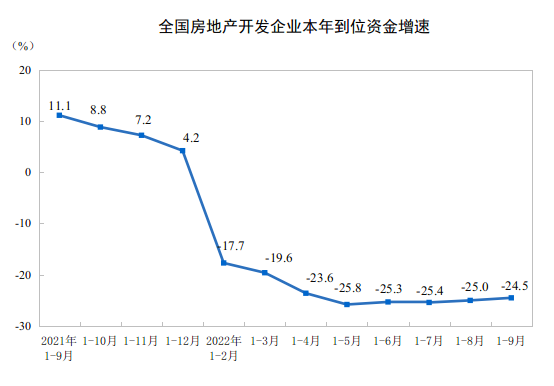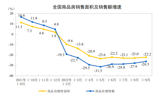 10月24日,国家统计局公布的《2022年1-9月份全国房地产开发投资和销售情况》显示,1-9月份全国房地产开发投资103559亿元,同比下降8.0%;商品房销售面积101422万平方米,同比下降22.2%;商品房销售额99380亿元,下降26.3%;房屋竣工面积跌幅连续2个月收窄,开发商资金面继续好转。