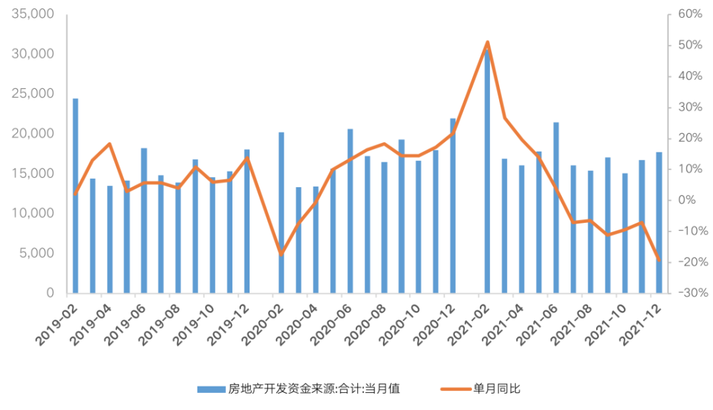 从房地产开发到位资金来看,2021年1-12月,房地产开发企业到位资金201132亿元,同比增长4.2%,规模创历史新高,但增速创近六年新低。且增速逐月下滑,下半年起到位资金单月值同比出现负增长,9月同比降幅达到11.2%。四季度政策密集发声后,但年末到位资金增速仍表现不佳,12月单月到位资金17770亿元,同比下降19.3%,单月到位资金规模低于历史同期,同比增速创近五年新低。