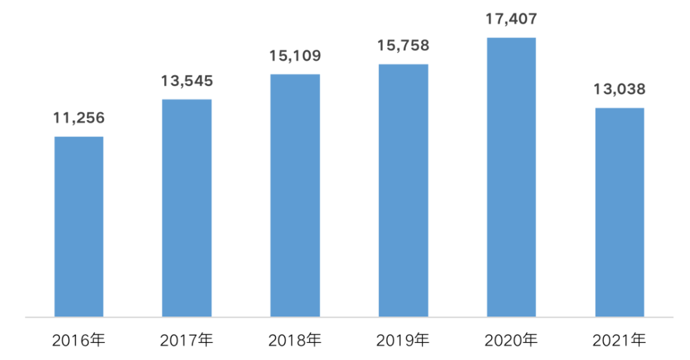 图:2016-2021年房企融资总量情况(单位:亿元)