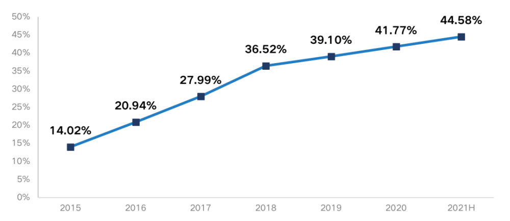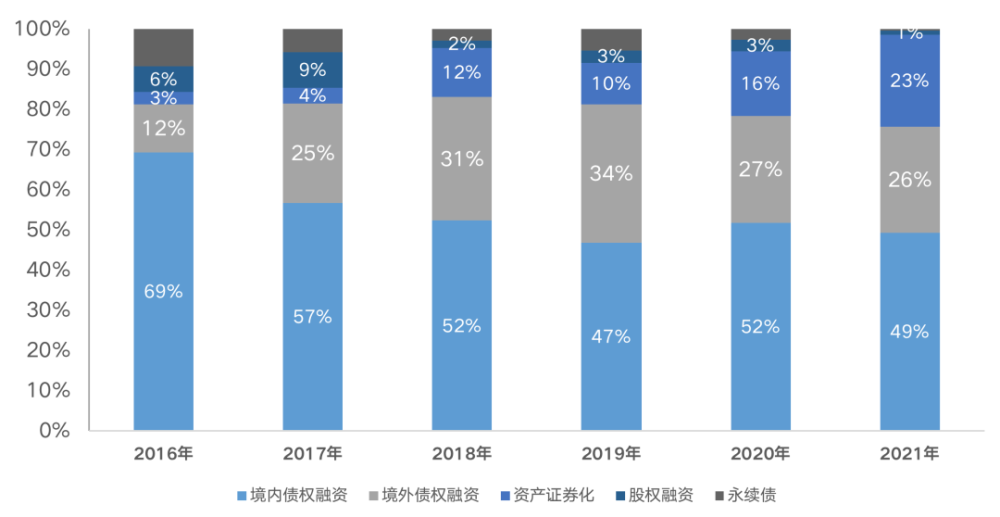 图:2016-2021年100家重点房企融资方式比例