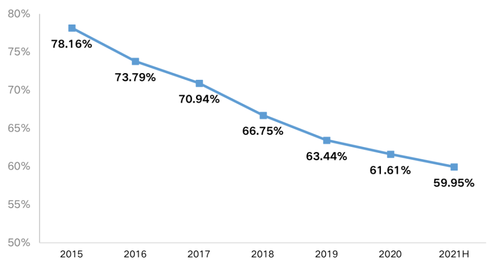 样本房企归母权益/总权益占比从2015年的78.16%减少至2021年中期的59.95%。少数股东权益增长过快,主要是近年来房企加大了项目的合作比例。