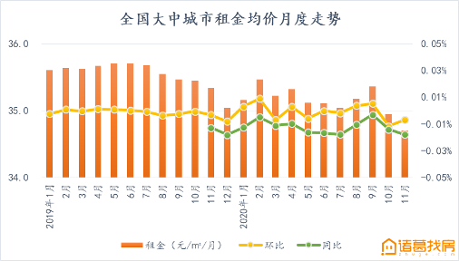 另一端,诸葛找房数据显示,11月全国大中城市租金挂牌均价为34.71元/平方米/月,环比下降0.7%,环比降幅较10月收窄了0.46个百分点。