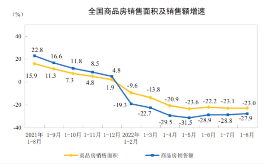 2021年1月~2022年8月,全国商品房销售面积及销售额增速。来源:国家统计局