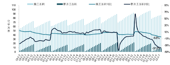 2014年至今全国房屋累计新开工和施工面积及其同比增速。来源:中指数据CREIS,国家统计局