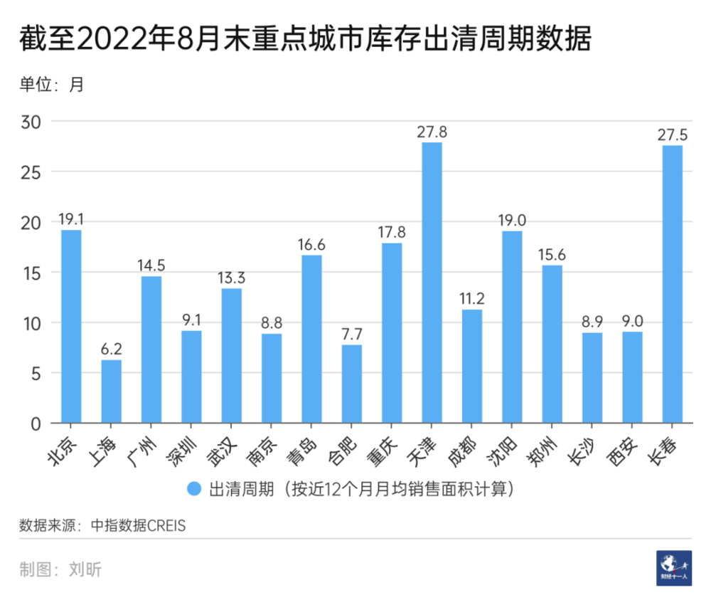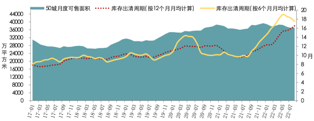 据中指研究院数据,以50个代表城市为样本,截至2022年8月末,按近6个月月均销售面积计算,短期库存出清周期为17.5个月。