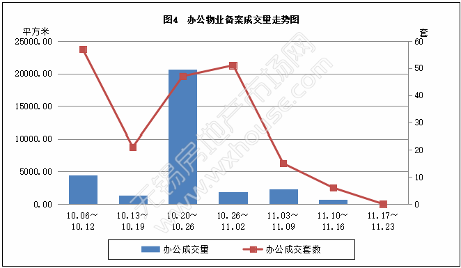 11月运行至第三周,无锡楼市周度波动较大。前三周全市商品房备案成交均量约为4.27万平方米,本周(11.17~11.23)仅为3.79万平方米,低于周均量11.24%。其中商品住宅备案成交量环比腰斩,对整体市场数据影响较大。同时,办公物业在本周备案成交量为零,同样拉低了整体数据。