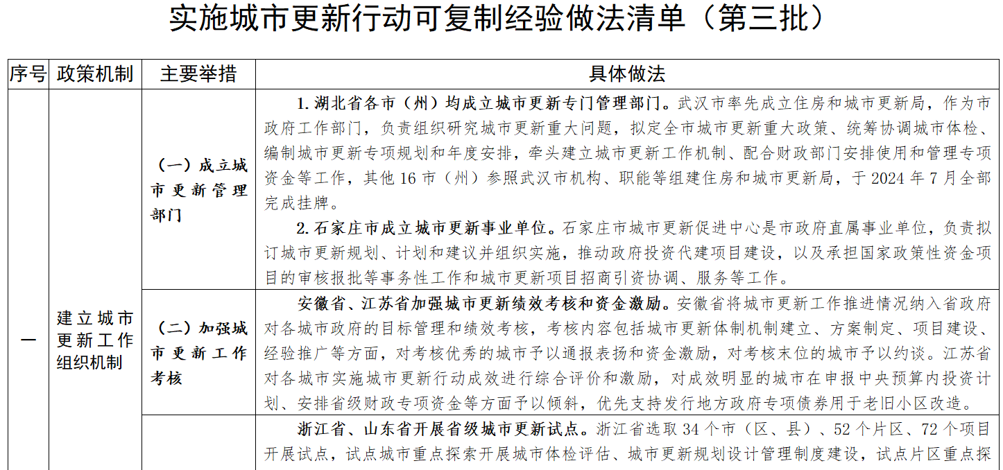 《通知》总结了各地在建立城市更新工作组织机制、完善城市更新法规和标准、完善城市更新推进机制、优化存量资源盘活利用政策、构建城市更新多元投融资机制、探索城市更新多方参与机制等方面经验做法,并向全国推广。