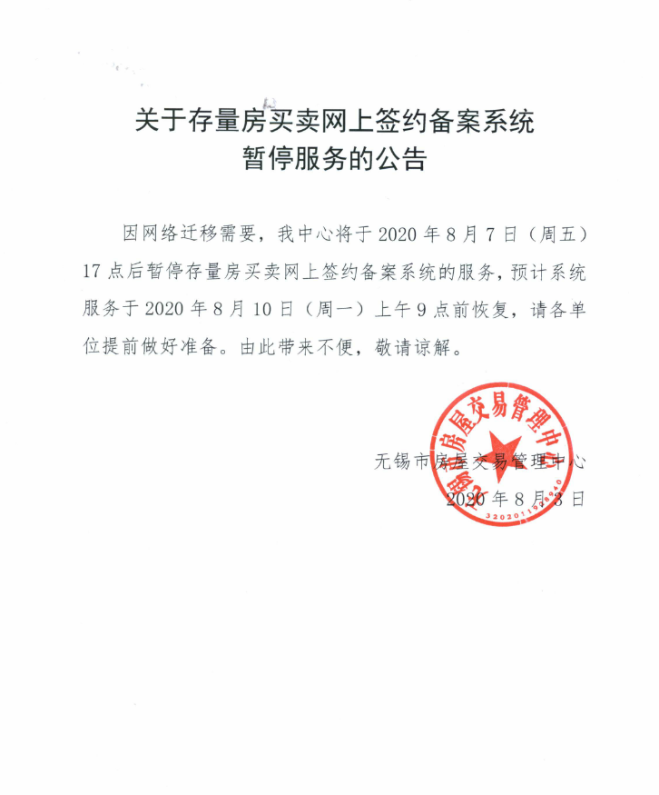 市场网首页 > 新闻中心 > 独家 > 正文 公告:8月7日17点后暂停存量房买卖网签备案 2020-08-03 17:14:37 无锡房地产市场网 本文为无锡房地产市场网原创,谢绝各类形式的转载、刊登。未经许可,私自转载者,本站将追究其相关法律责任。 (责任编辑:李飞飞)