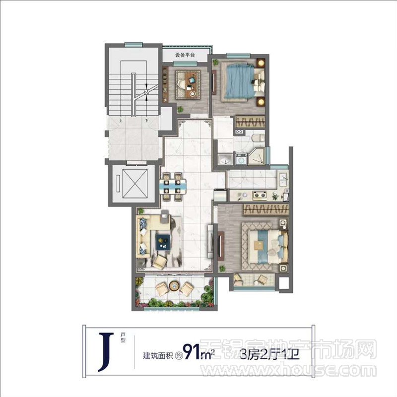 3室2厅1卫 建筑面积约:91.0㎡J户型
