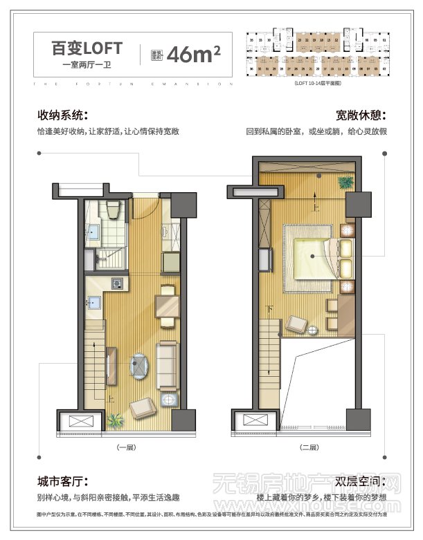1室2厅1卫 建筑面积约:46.0㎡百变LOFT户型