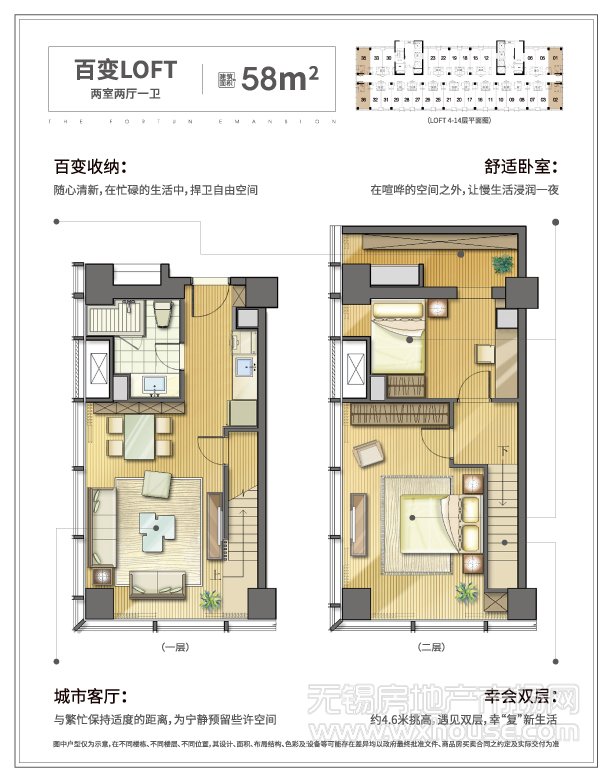 2室2厅1卫 建筑面积约:58.0㎡百变LOFT户型|