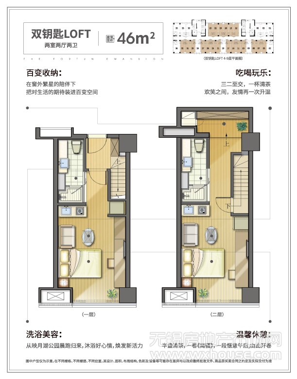 2室2厅2卫 建筑面积约:46.0㎡双钥匙LOFT户型