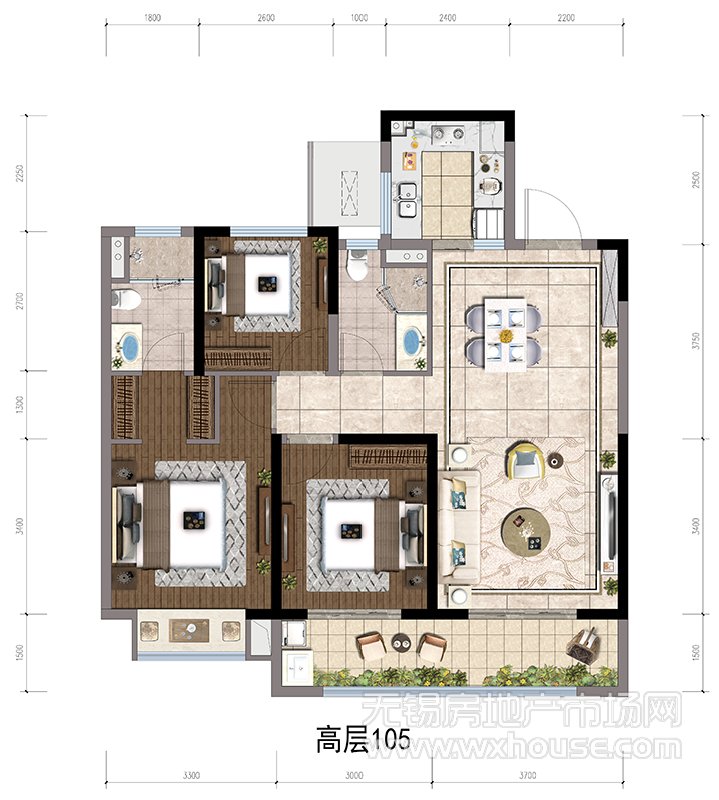 3室2厅2卫 建筑面积约:105.0㎡高层106㎡户型