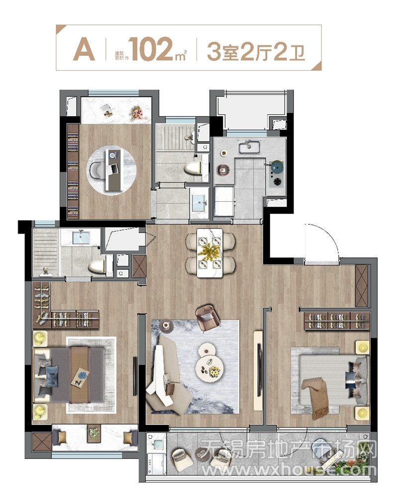 3室2厅2卫 建筑面积约:102.0㎡洋房A户型
