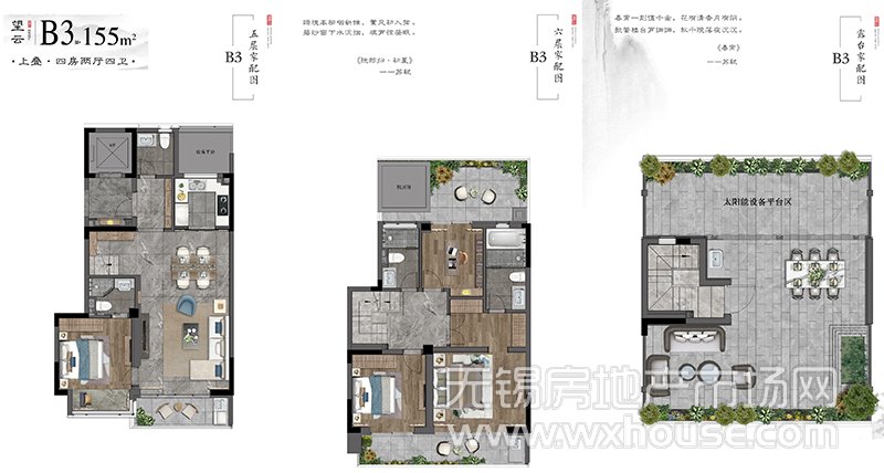 4室2厅4卫 建筑面积约:155.0㎡上叠B3户型