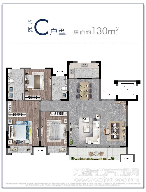 3室2厅2卫 建筑面积约:130.0㎡C户型玺悦