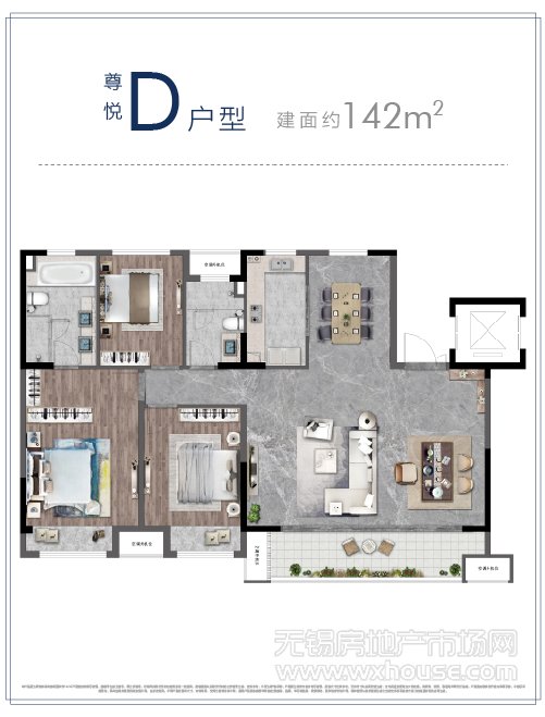 3室2厅2卫 建筑面积约:142.0㎡D户型尊悦