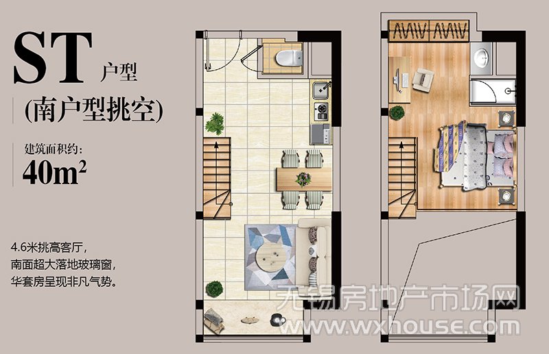 1室2厅2卫 建筑面积约:40.0㎡ST户型(南户型挑空)