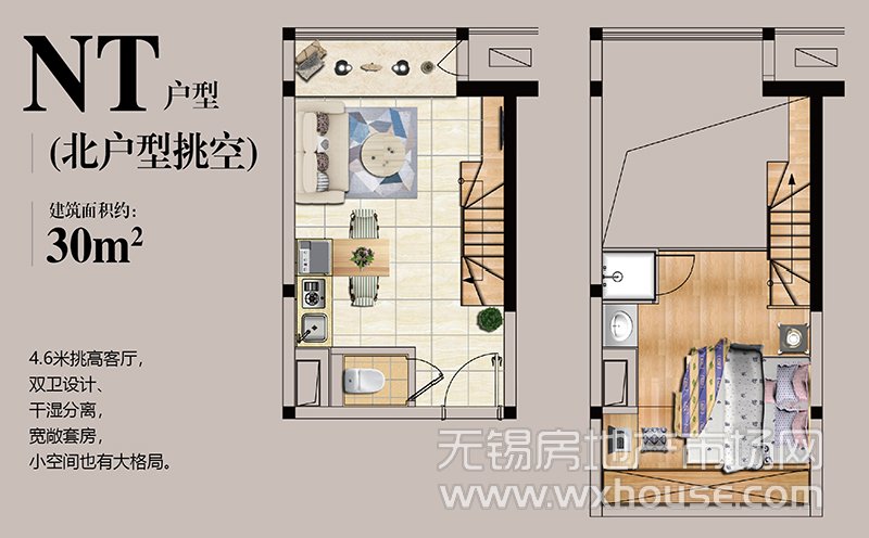 1室2厅2卫 建筑面积约:30.0㎡NT户型(北户型挑空)