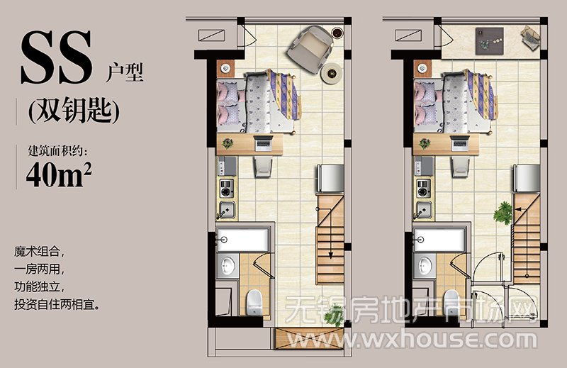 2室2厅2卫 建筑面积约:40.0㎡SS户型(双钥匙)