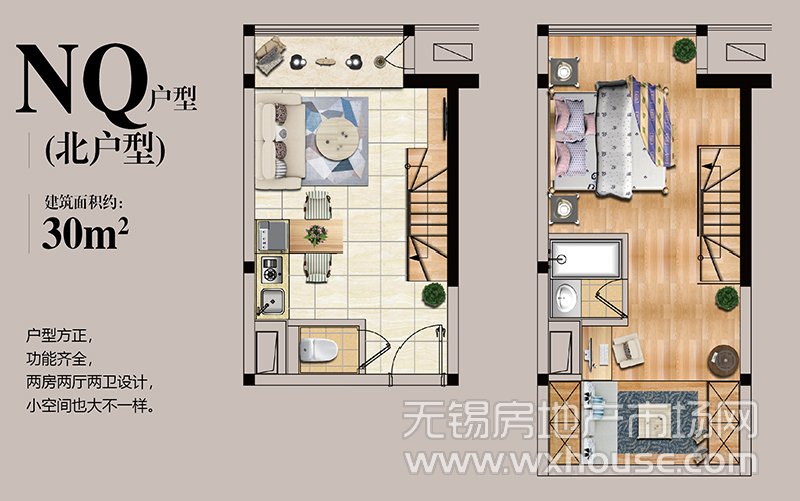 2室2厅2卫 建筑面积约:30.0㎡NQ户型(北户型)