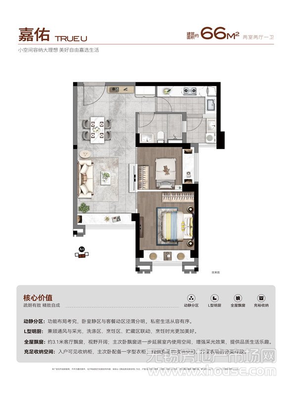 2室2厅1卫 建筑面积约:66.0㎡嘉佑户型